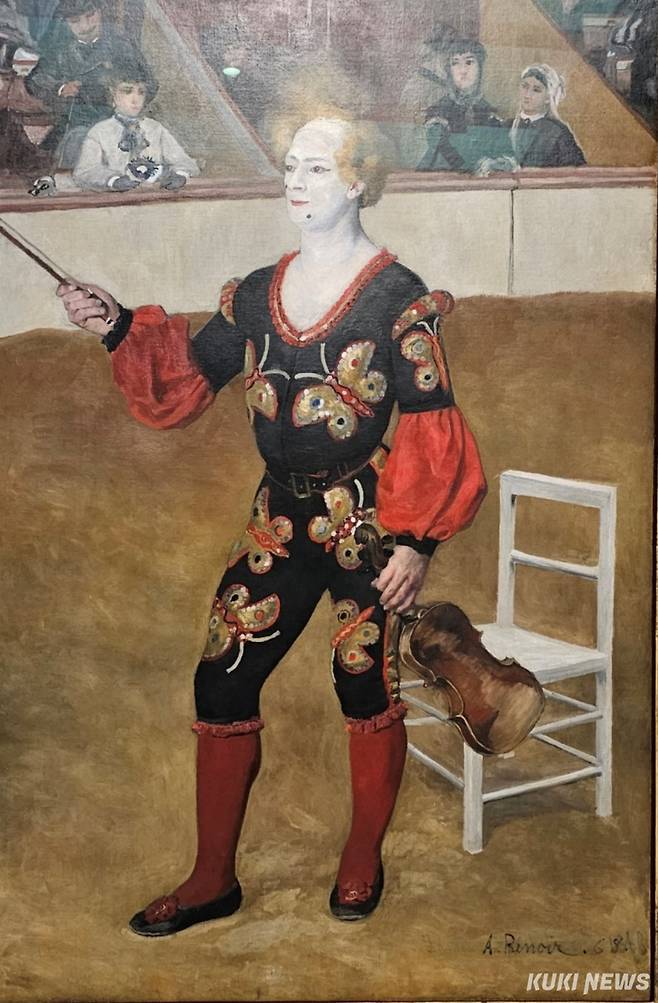 르누아르가 그린 광대는 단순한 공연자의 초상이 아니다. 어두운 의상에 수 놓인 커다란 나비, 붉은 소매와 스타킹은 링의 모래와 흰 벽, 의자와 극적인 대비를 이루며 시선을 사로잡는다. 연주를 멈춘 광대는 마치 최면에 걸린 듯 정면을 응시하고, 고정된 자세는 묘한 긴장감을 자아낸다. 이 작품을 보는 순간 루제로 레온카발로의 오페라 <팔리아치 (Pagliacci광대들)> “의상을 입어라” 아리아가 들려왔다.
