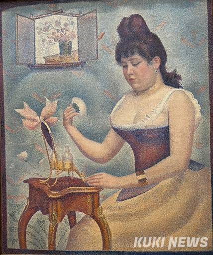 쇠라는 마들렌이 임신하자 더 쾌적한 작업실로 이사했고, 1890년 2월 16일 첫 아들 피에르가 태어났다. <화장을 하는 젊은 여인>은 그 시기의 작품으로, 사랑하는 여인을 바라보는 화가의 시선이 고스란히 담겨 있다.