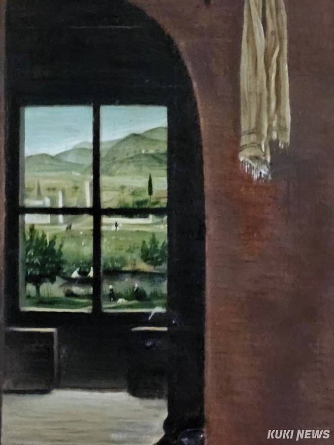 양쪽 창문으로는 중세 유럽의 풍경과 서재 위 창문에는 예수 그리스도의 부활을 상징하는 제비가 날고 있다.