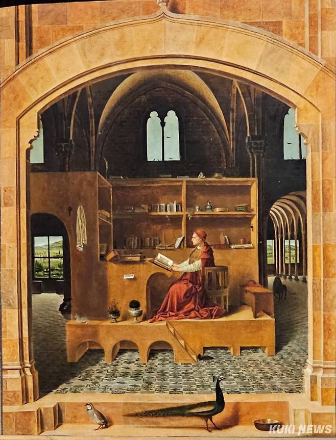 안토넬로 다 메시나(Antonello da Messina, 1425/1430~1479)의 <서재에 있는 성 히에로니무스>가 기원이다. 4세기에 활동했던 성인이 책을 읽는 모습을 15세기 서재의 구조와 상징으로 정교하게 담아낸다. 성인은 그리스어로 된 성경을 라틴어로 번역하였고, 그 “불가타(Vulgata) 성경”은 아직도 가톨릭에서 사용하고 있다.
