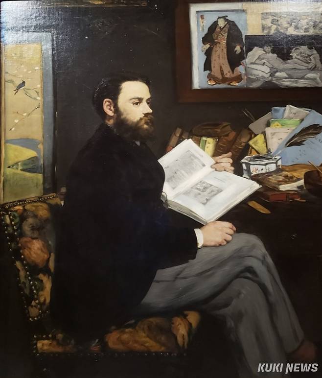 가장 눈에 띄는 것은 졸라 뒤에 걸린 마네의 문제작 <올랭피아> 복제본이다. 당시 논란의 중심에 있었던 이 작품을 졸라는 ”현대 회화의 진정한 혁신”이라 평가하며 적극적으로 옹호했다. 마네는 그런 졸라에게 감사의 뜻을 담아 이 초상화를 그렸다. 책상 위에 펼쳐진 샤를 블랑(Charles Blanc, 1813~1882)의 <그림의 역사>는 졸라가 예술을 단순한 감상이 아닌 사유와 비평의 대상으로 여겼음을 상징한다.