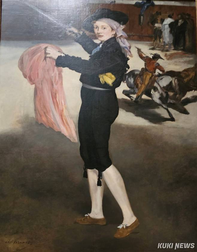 마네는 1863년, 살롱 데 레퓌제(Refuses)에 모델 빅토린 뫼랑(Victorine Meurent)을 르네상스 판화에서 차용한 포즈로 투우에 어울리지 않는 신발을 신고 분홍색 망토로, 전통을 비틀면서도 용기를 상징하는 작품을 출품했다. 스페인 낭만주의를 대표하는 고야가 투우 장면을 묘사한 시리즈를 재현하며, 마네가 스페인과 고야의 품은 경외를 드러냈다.