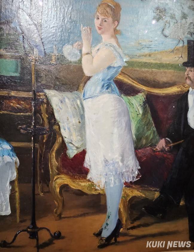 에밀 졸라의 소설 <나나>의 주인공은 코르셋을 입고 수놓은 스타킹에 하이힐을 신고 후원자 앞에서 화장을 한다. ‘나나(Nana)’라는 이름은 19세기 후반 매춘부들이 흔히 쓰던 가명이었다. 장난기 어린 미소를 머금은 여자는 관람객을 힐끗 쳐다보고, 소파에 있던 남자는 두 동강이 났다. 그는 가구 한 점보다 더 중요하지 않다. 이 그림의 모델은 당시 유명한 고급 창녀였던 헨리에테 하우저(Henriette Hauser)였다. 이 작품은 현대 파리 여성을 묘사한 마네의 상징적이면서도 논란이 많은 작품이다.