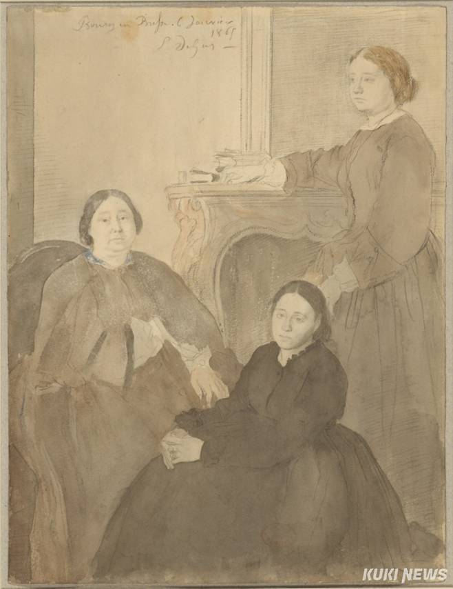 에드가 드가, 미셸 무송(Michel Musson)과 그녀의 딸, 에스텔(Estelle)과 데지레(Desiree), 1865, 크림색 직조지에 연필에 수채화, 목탄, 붓, 붉은색 파스텔 물감을 덧칠하고 흰색 과슈로 강조한 작품, 35x26.5cm, 시카고 미술관