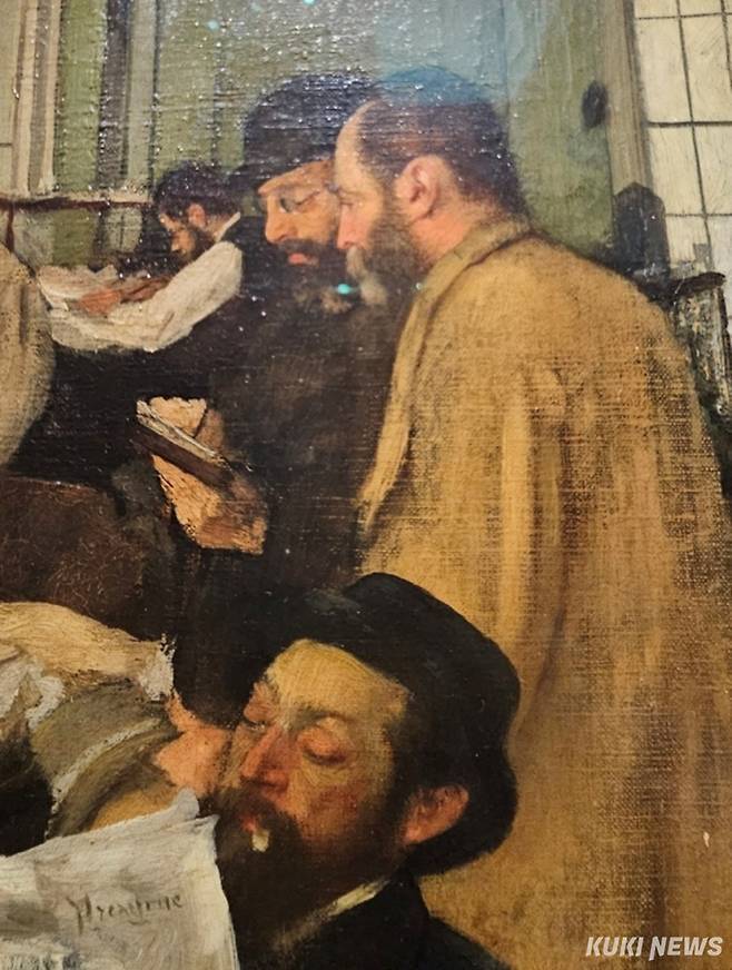 <뉴올리언즈의 목화 시장> 부분: 목화를 살펴보는 외삼촌 미셸 무송과 칸막이에 기댄 드가의 동생 아킬레.