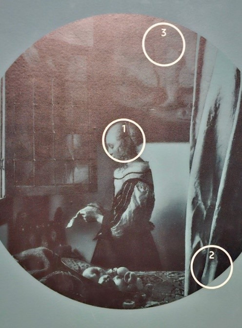 전시된 페르메이르 작품들은 모두 적외선 사진 등 과학적인 조사가 이루어졌고 주의 깊게 보아야 할 부분은 번호로 아래와 같이 표시하여 관람자들에게 친절히 설명해 주고 있었다.