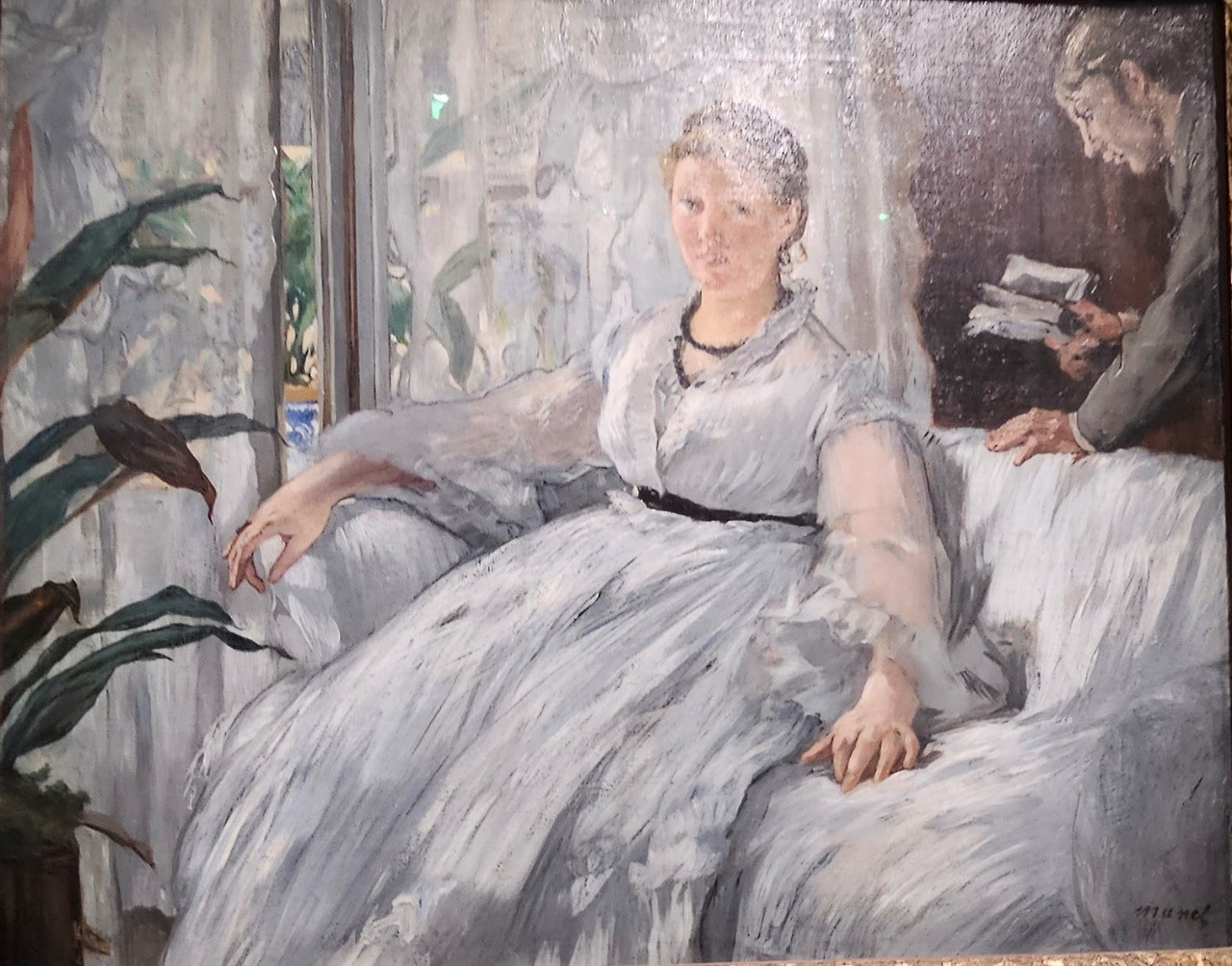 에두아르 마네, 독서(마네 부인과 아들 레옹 린호프, 1866년경, (아마도 1873년 다시 그려진 린호프는 성장 후 드가의 은행에서 사환으로 일했다)