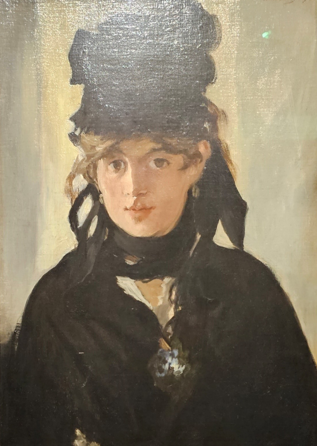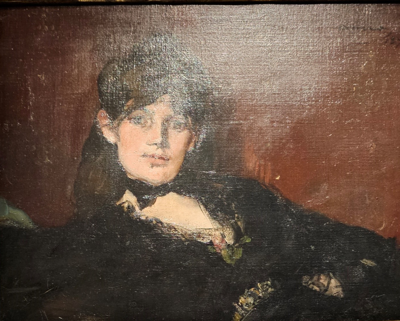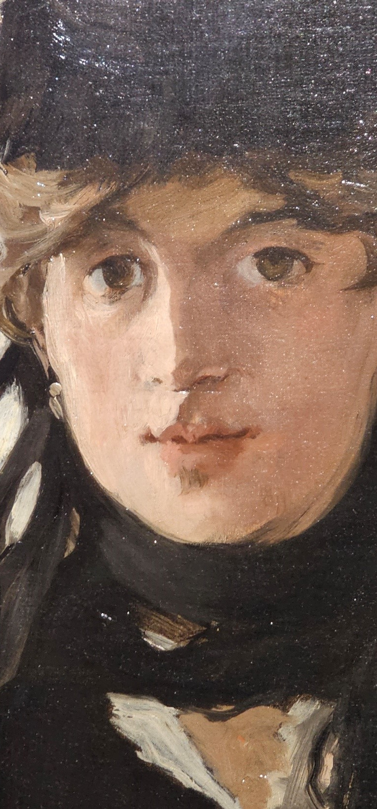 에두아르 마네, 베르트 모리조의 초상, 1873, 캔버스에 유채, 34x26cm, 파리 마르 몽탕 모네 미술관: 빨강과 검정의 하모니에 기대어 누운 듯한 모리조의 각진 턱과 윤곽이 두드러지며 우아하다.