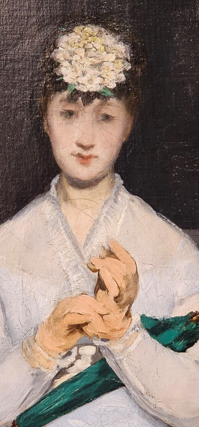 모리조의 목 주변 푸른 점 두 개는 반사된 미술관 조명이다. 서 있는 클라우스와 비교하면 그녀의 공허한 큰 눈과 이지적인 미모가 더욱 빛난다.