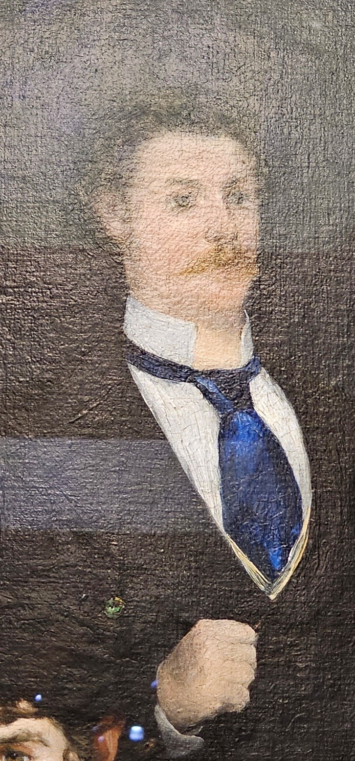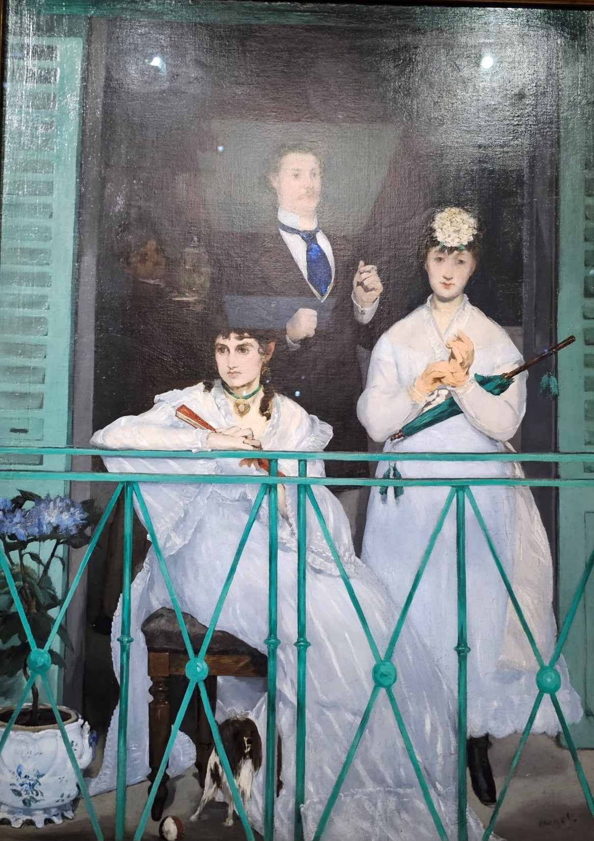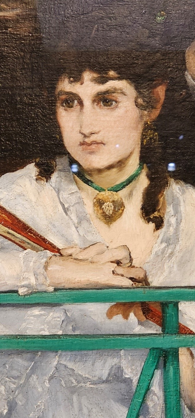 에두아르 마네, 발코니, 1868-69년, 캔버스에 유채, 170 ×124.5cm, 파리 오르세 미술관: 가운데 있는 남자는 풍경 화가 기유메. 그의 얼굴에 밝은 삼각형과 양 옆의 빛은 미술관의 외부 조명 때문이다.