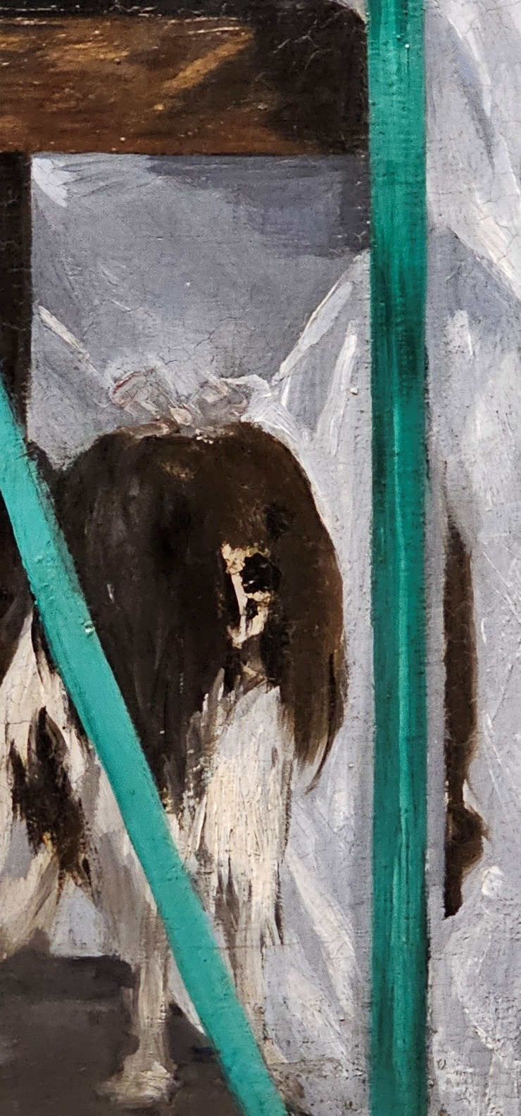 난간 뒤에 인물들이 원근법 없이 배치되어 정물화 같다는 비난도 하였다. 모리조 발치에서 공을 가지고 노는 강아지는 고정된 듯한 인물들과 대조를 이루고 있다. 필자도 이 작품을 처음 보았을 때 인물들만 보았다. 그런데 강아지에 대해 언급된 글을 보고 강아지를 찾아보았고, 그런 기억이 이 사진을 찍게 만들었다.