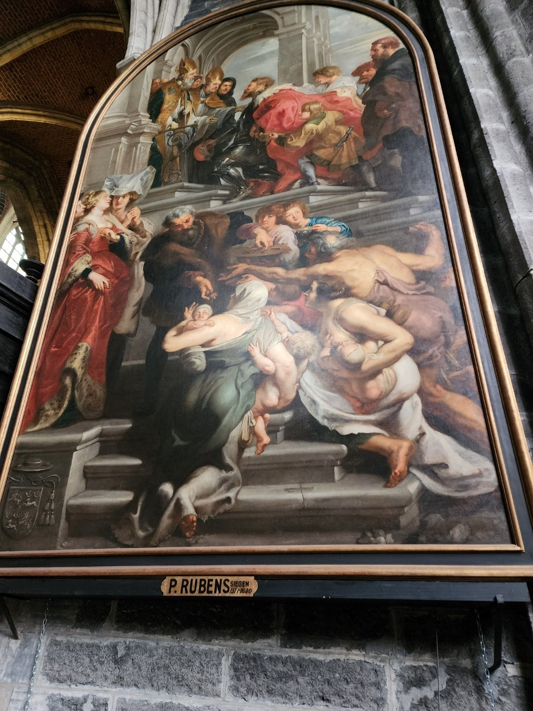 엘리베이터를 타고 제단화를 보러 가는 길에 오랜 성당의 역사만큼 많은 그림이 있다. 특별히 오토 반 벤과 루벤스, 스승과 제자의 작품이 서로 마주 보고 있다. 그 하나는 루벤스가 그린 성 바봉 대성당 유래에 대한 작품으로 오랜 명성을 얻어 왔다.