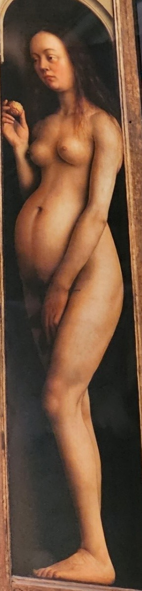 에덴동산에서 타락한 아담과 이브는 중세 천년 이후 그려진 최초의 누드화이다. 반 에이크는 스스로 검열을 하여 그들의 손에 무화과 잎사귀를 쥐어 주었다. 상단 천상 세계의 인물들이 입은 의상의 호사스러움과 아담과 이브의 누드가 대비되는데 이는 원죄의 크기만큼 날카롭고 매섭다.