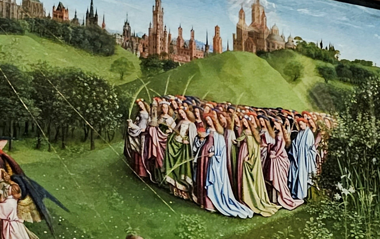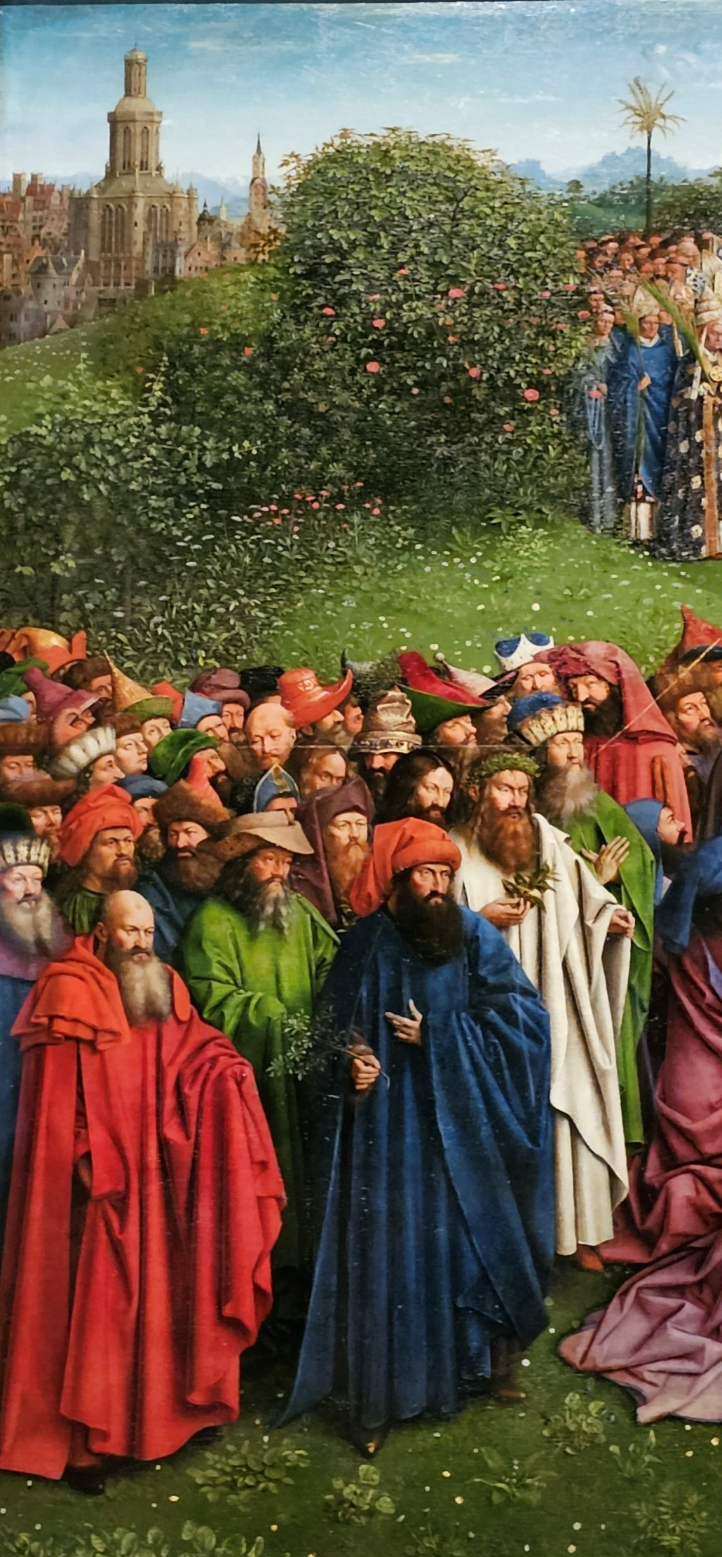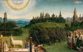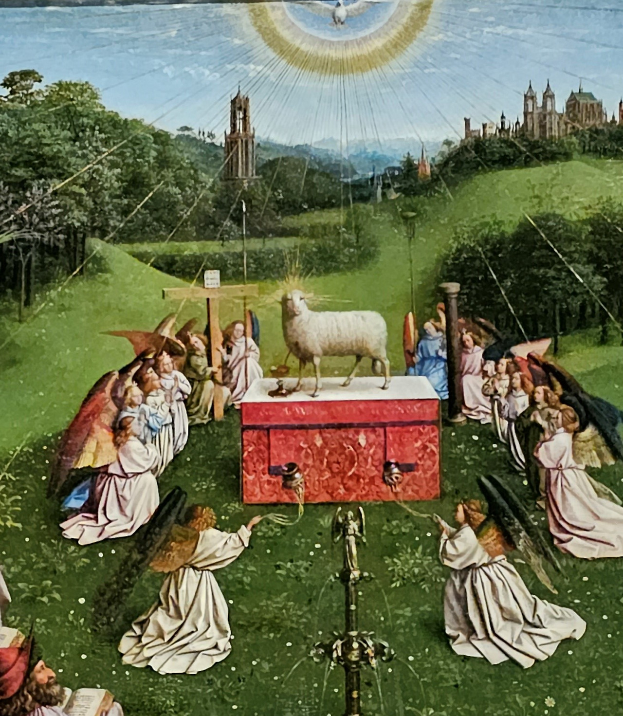 하늘을 배경으로 푸른 초원에서 어린양에 대한 경배를 하고 있다. <어린양에 대한 경배>에서 수직으로 빛, 어린양의 성혈 그리고 세례를 상징하는 물이 삼위일체를 형성한다. 인간과 신이 등장하는 풍요롭고 완벽한 겐트를 소우주로, 새로운 예루살렘으로 설정했다.