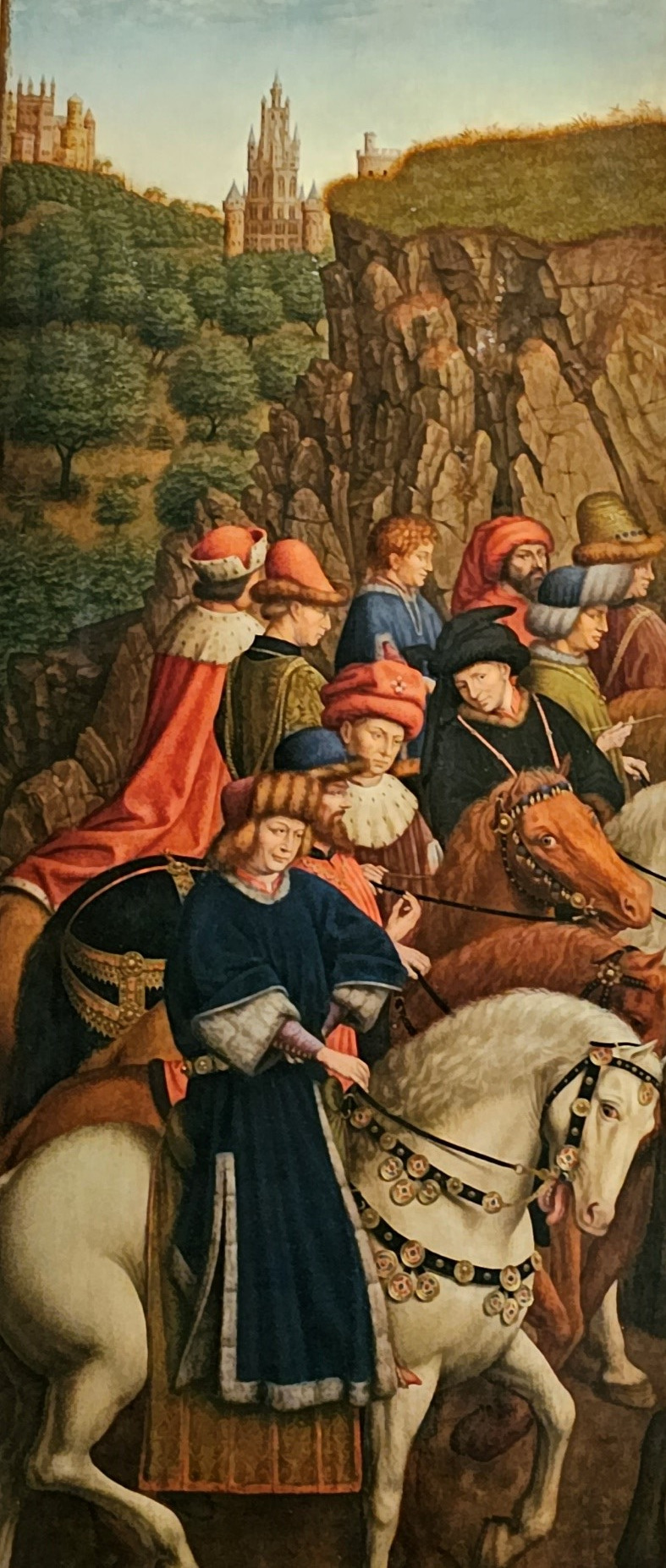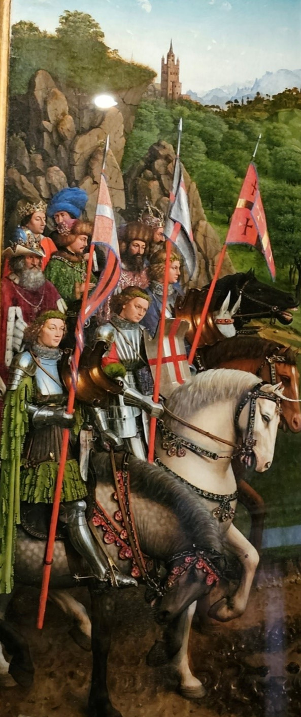 아래 왼쪽 이 부분은 도난당한 <의로운 판관> 패널로 복제화이다. 메인 패널인 [세례자 요한]을 돌려준 도둑에게 그래도 일말의 양심은 남았나 보다. 후베르트와 얀 반 에이크 형제는 자신들의 모습을 서명으로 그렸을 것으로 짐작된다.