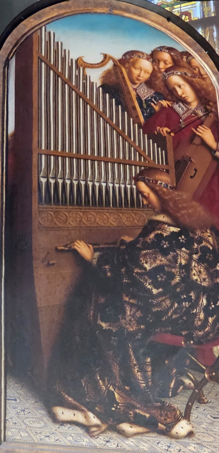 음악을 들려주는 천사들이 입은 비단옷의 광택과 보석의 광채를 표현한 광학적인 부분을 주목해야 한다.