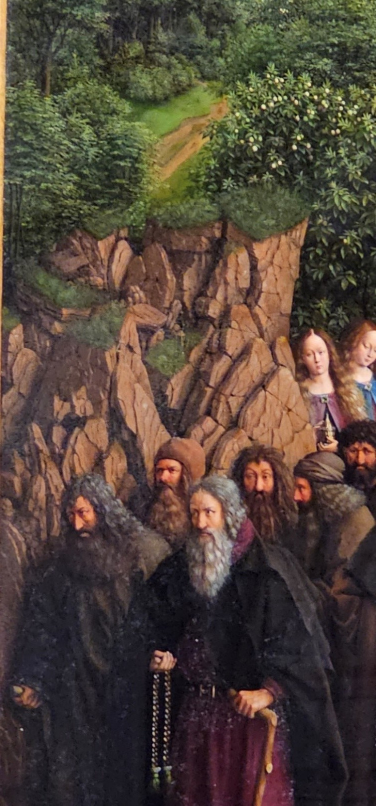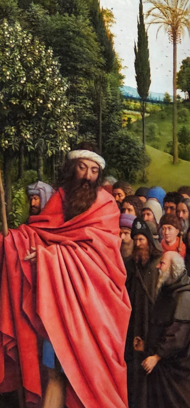 붉은 옷을 입은 키가 큰 이는 여행자의 수호성인인 성 크리스토퍼이다. 그를 앞세우고 은수자들과 순례자들이 자갈길을 맨발로 걸어오고 있다. 지중해나 에스파냐 그리고 예루살렘까지 다녀온 반 에이크는 그곳에서 자라는 나무들을 그대로 표현했다. 이는 특정한 장소가 아닌 소우주를 상징하기 때문이다.