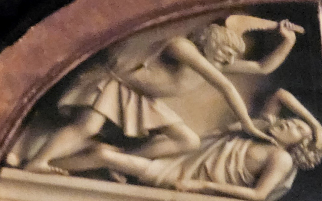 화면 상단 오른쪽 이브 위에는 카인이 아벨을 살해하는 장면이 조각처럼 그리자이유 기법으로 그려졌다. 인류 최초의 살인을 묘사한 부정적인 장면은 여성인 이브 위에 그려졌다.