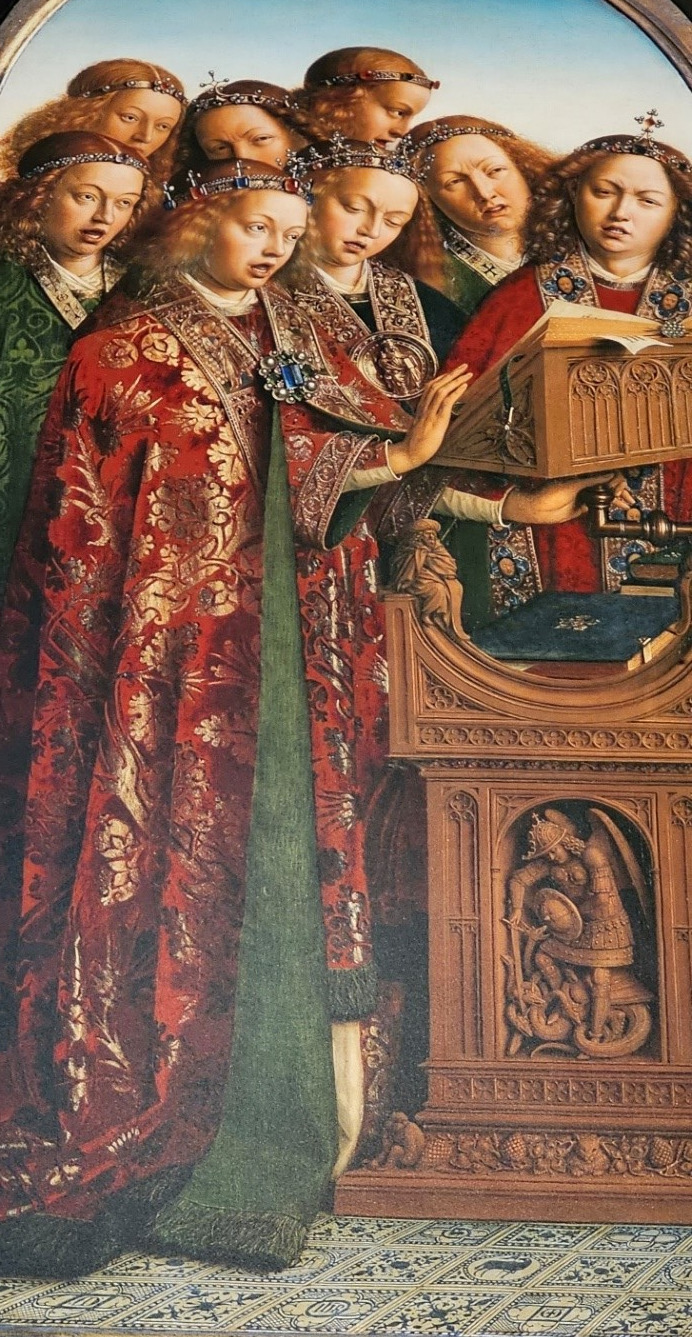 생기 넘치는 천사들의 표정이 중앙 인물들의 엄숙하고 진지한 분위기를 누그러뜨린다. 노래하는 천사들은 입모양만으로 누가 소프라노이고, 메조이고, 알토인지 구분할 수 있다. 왼편 앞줄 세 천사는 고개를 아래로 접고 노래를 부르는 걸 보면 알토인 듯하다. 오른편 이마를 찌푸리며 인상을 쓰고 있는 세 천사는 ‘누군가 뒤에서 음정이 틀려서 그런 표정을 짓고 있는 게 아닌가’라는 재미난 상상하게 한다.