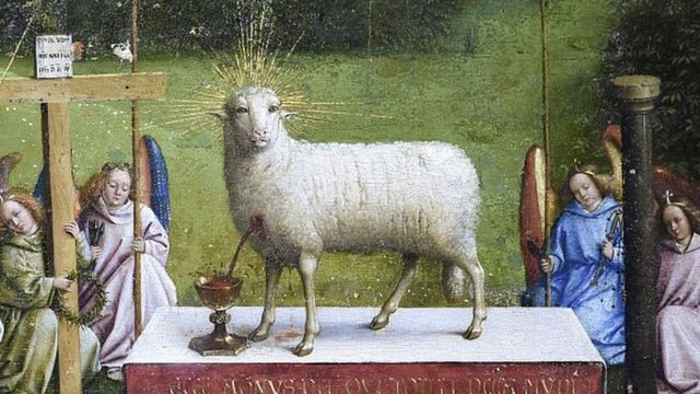 붉은 제단이 있고, 제단 위에는 어린양이 서 있다. 어린양의 가슴에서 붉은 피가 흘러나와 잔에 떨어지고 있다. 원제는 <신비로운 어린양의 경배 Adoration of the Mystic Lamb>였다. 하느님의 어린양은 아담과 이브의 원죄로부터 인류를 구원하기 위해 희생양이 되어 성혈을 흘리고 있음을 의미한다.