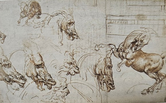 다빈치는 오래전부터 말에 매료되었다. 그는 강박적으로 말을 그렸고, 밀라노의 공작 스포르차를 위해 선친의 기마상을 만들 땐 말을 해부하며 비교동물학에 대해 흥미를 느꼈다. 그리하여 동물은 통각을 가지고 있다는 연구로 채식주의자가 되었다. 그러나 식솔들을 위해서는 고기를 구입할 정도로 따뜻한 마음을 가진 천재였다. 피렌체 정청의 [앙기아리 전투] 벽화를 위한 준비 그림에서 그의 코덱스(Codex, 노트) 중 밑그림용으로 스케치한 말 그림이 있다. 스케치에서 말들은 그가 그린 사람들만큼 강렬한 동작과 감정을 보여준다.