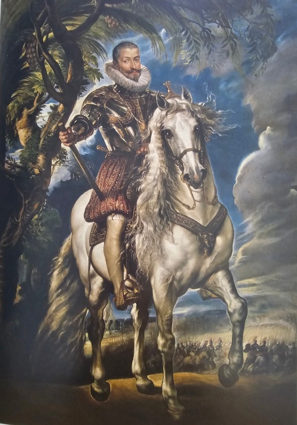 루벤스는 이 승마 초상화의 구성을 통해 그의 개념적이고 지적인 강점을 보여줄 뿐만 아니라, 붓질과 표현에 있어서도 자신의 전문성을 보여주고 있다. 예를 들어, 그는 공작 갑옷의 흉판(Breastplate 胸板)을 특별히 신경을 써서 섬세하게 묘사했다. 위엄 있는 신분의 상징인 흉판은 아마도 밀라노의 갑옷 공방에서 나온 특별히 값비싼 작품이었을 것이다.