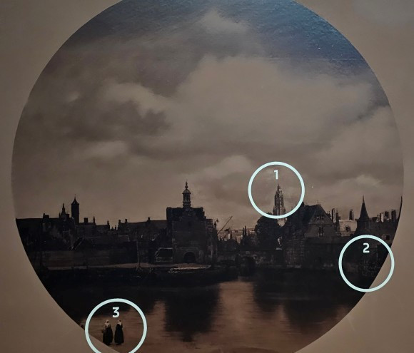 암스테르담 국립미술관의 페르메이르 전에서 [델프트의 풍경]이 가장 먼저 전시되었고, 주의 깊게 보아야 할 부분은 번호로 표시하여 아래와 같이 설명한다.