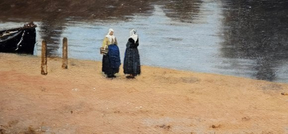 (델프트의 풍경 중 아래 부분, 스히담 강가에서 파란 치마를 입은 17세기의 여인들이 이야기를 나누고 있다.)