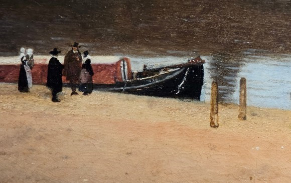 다시 그림의 아래를 보면, 배가 정박한 선착장에서 담소를 나누는 아기를 안은 여인을 비롯한 몇몇 사람들이 보인다. 델프트는 강과 운하를 따라 사람과 물건들이 흘렀다.