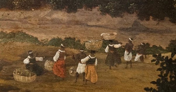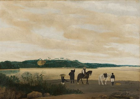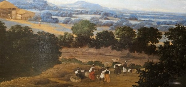 프란스 포스트, 브라질 이타마라카 섬의 풍경, 1637:실루엣으로 묘사되었지만 농장주와 흰 반바지만 입은 노예들의 삶이 드러난다.