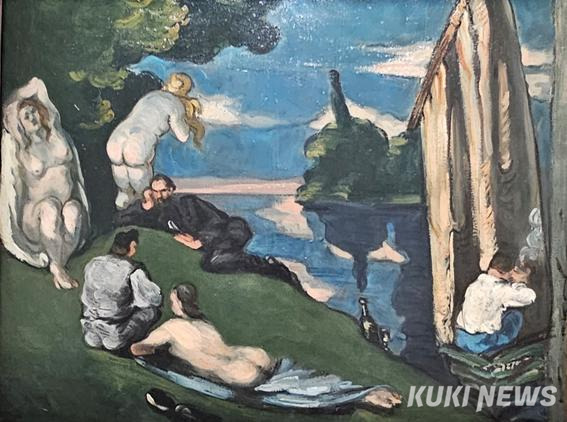 세잔의 초기 누드인 이 작품은 두껍고 가득 차 더 이상 수용할 수 없는 포화상태다. 풍경을 배경으로 옷을 입은 두 남자와 세 명의 여인 누드이다. 이는 몇 년 전에 서양미술사 최대의 스캔들로 유명해진 마네의 <풀밭 위의 점심>을 재해석한 작품이다.