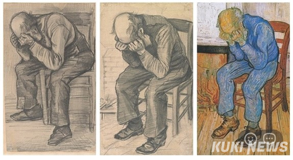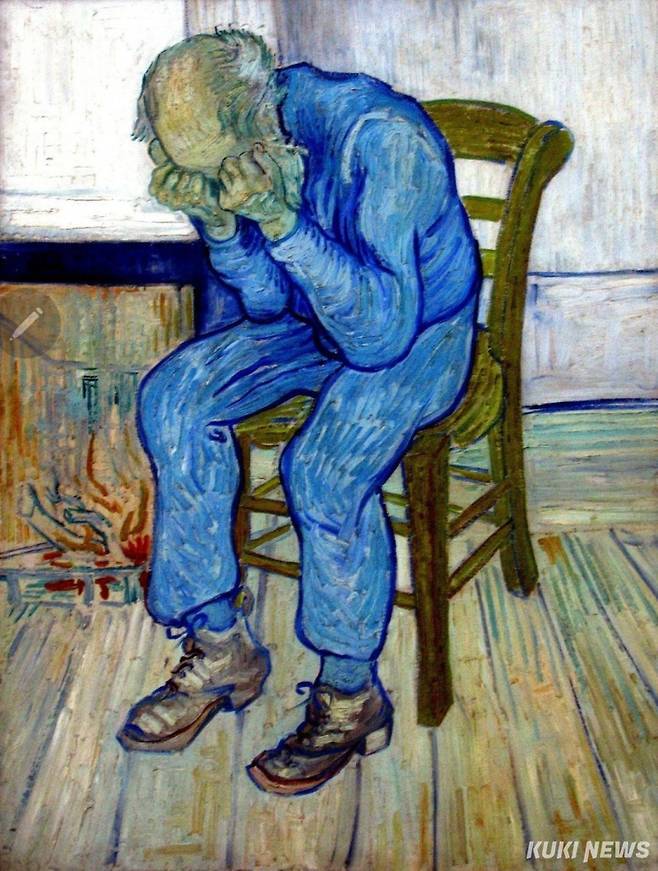 이 그림은 1882년 네덜란드에서 그린 석판화를 1890년 생 레미에서 다시 그린 유화이다. 나무 의자에 앉은 노인이 두 손으로 얼굴을 감싼 채 고통스러워하고 있다. 빈센트의 개성이 드러나는 검은 아우트라인과 거친 터치의 해칭이다. 노인이 입은 파란색 환자복은 마치 죄수복처럼 보인다. 죄를 지어 신체를 구속해 놓은 것보다 통제할 수 없는 정신이상이 더 괴롭고 암울하다. 오렌지와 고동색, 수직과 수평으로 강조된 초록색 나뭇결은 불안을 고조시키고 잠식하게 만든다. 이미 정신 병원에 갇혀 있지만 자기 자신을 제어할 수 없는 상황이 너무도 고통스러운 노인이다.