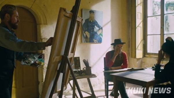 영화 <고흐, 영원의 문에서>고갱과 빈센트가 지누 부인을 그리는 장면, 벽에는 조셉 룰랭의 초상화가 있다.