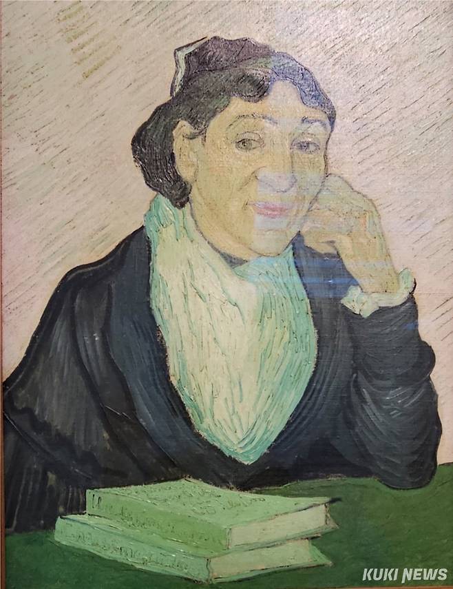 빈센트는 그녀가 단순한 카페의 안주인이 아니라, 더욱 고귀한 존재로 보이길 바랐다. 그래서 초록빛 테이블 위에 책 두 권을 올려놓아 그녀의 지성을 강조했고, 마치 상류층 여인처럼 우아한 분위기를 연출했다.
