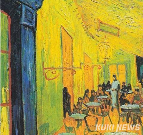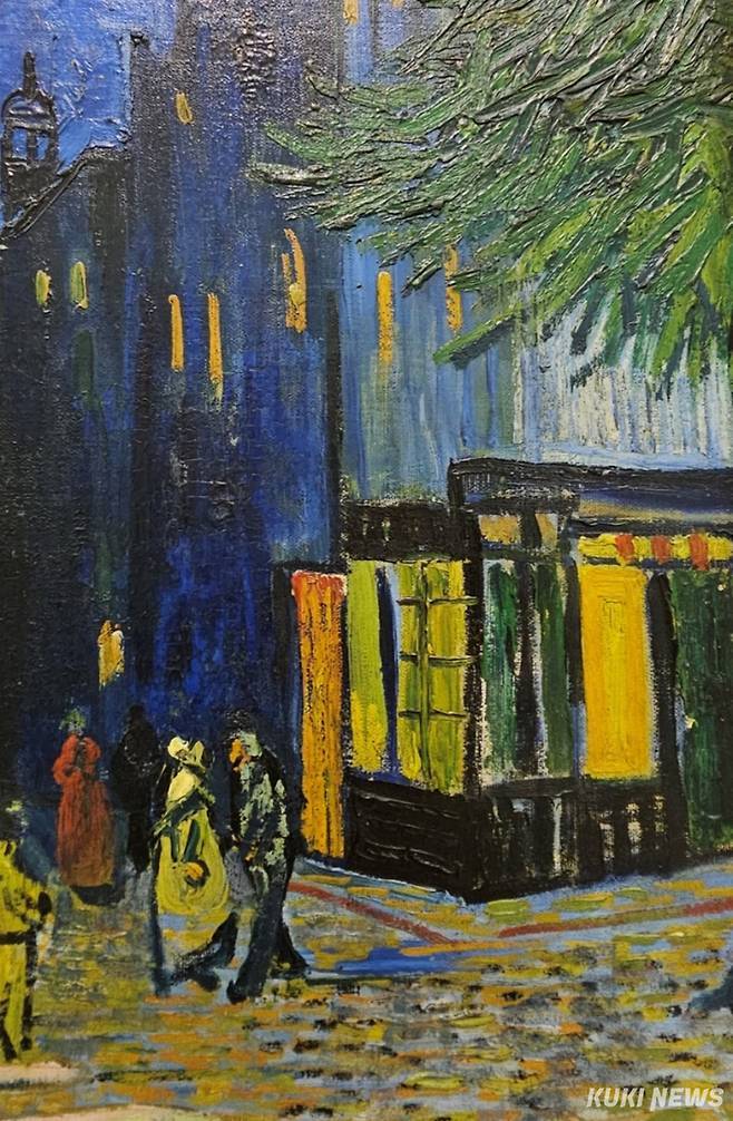 카페를 비추는 가스 램프의 노란빛은 별이 빛나는 하늘의 푸른색을 더욱 짙게 만들며, 빈센트가 애착을 가졌던 무더운 여름 밤의 평온한 감정을 그대로 전달한다. 그가 그린 밤은 어둠이 아닌 빛으로 가득 차 있다.
