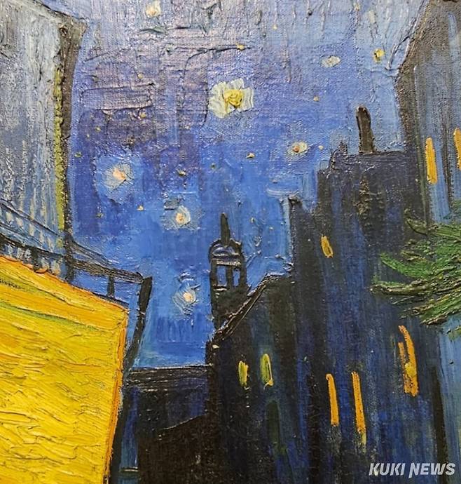 빈센트의 붓질은 거칠고 투박하지만 그만큼 강렬한 감동을 준다. 물감의 두께와 질감을 통해 별이 살아 숨 쉬는 듯한 느낌을 주며, 얇게 칠해진 고갱의 그림과는 또 다른 진정성과 열정이 담겨 있다. 그래서 그의 작품 앞에 서면 유리를 통해 선명히 볼 수 없어도 무의식적으로 한 걸음 더 다가가서 바라보게 된다.