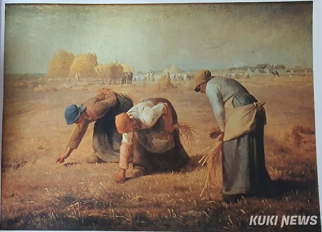 이삭을 줍는 여인들 뒤로 수확한 짚단을 쌓아놓은 노적가리와 저택 그리고 말을 탄 농장관리인이 있다. 프랑스는 농업 국가이고 가톨릭 국가로 이삭을 주어가게 하는 전통이 있었다. 하루 종일 모아도 한끼나 제대로 해결할 수 있을지. 세 여인은 빨간색, 노란색, 파란색 머리수건과 자세로 변화를 주었다. 햇빛에 그을려 까맣게 탄 얼굴과 손, 파란 수건을 쓴 여인은 허리가 아픈지 한 손을 허리에 올리고 있다.