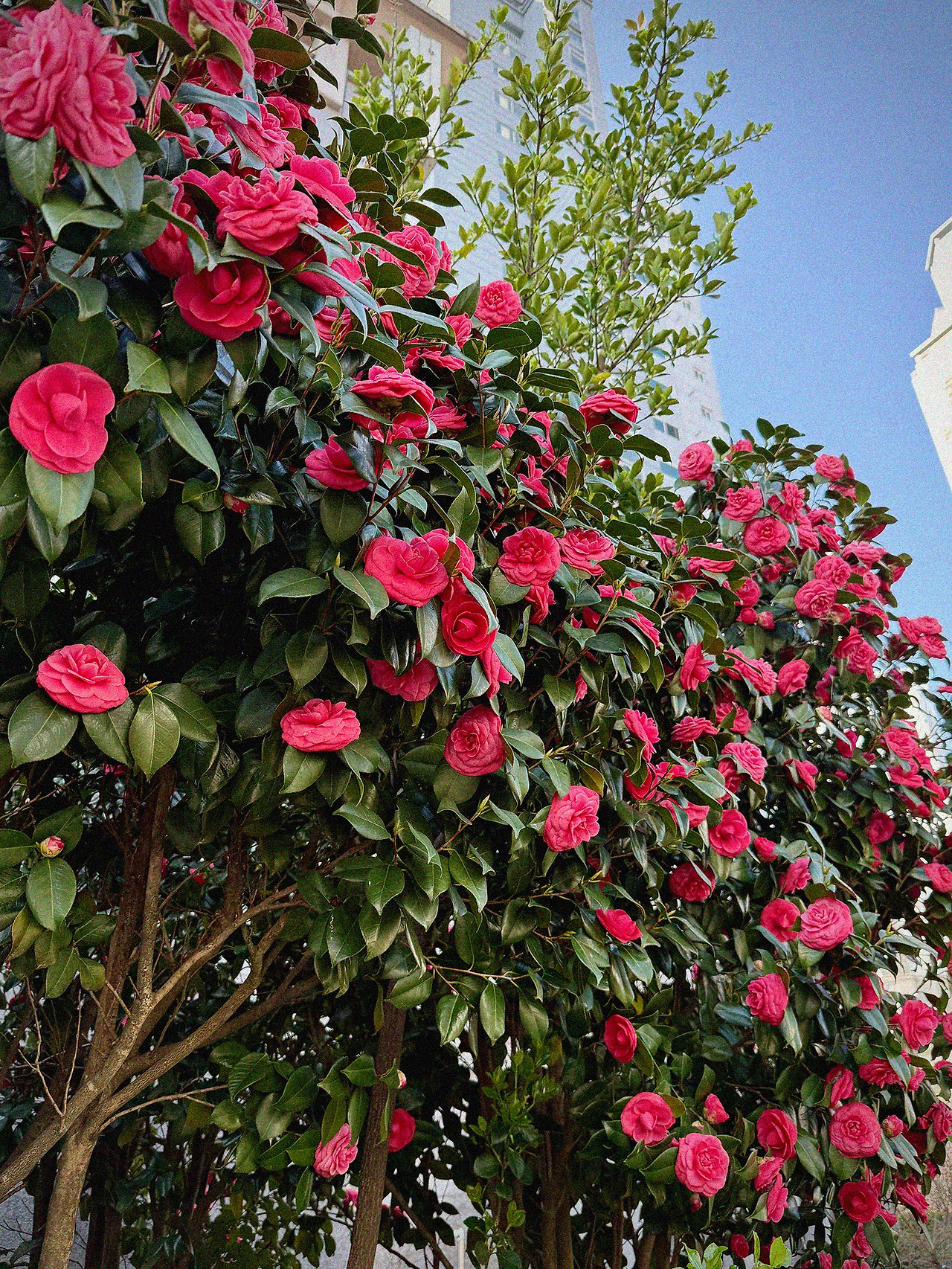 <동네에서 발견한 큰 동백나무와 벚꽃나무 밑 동백나무>