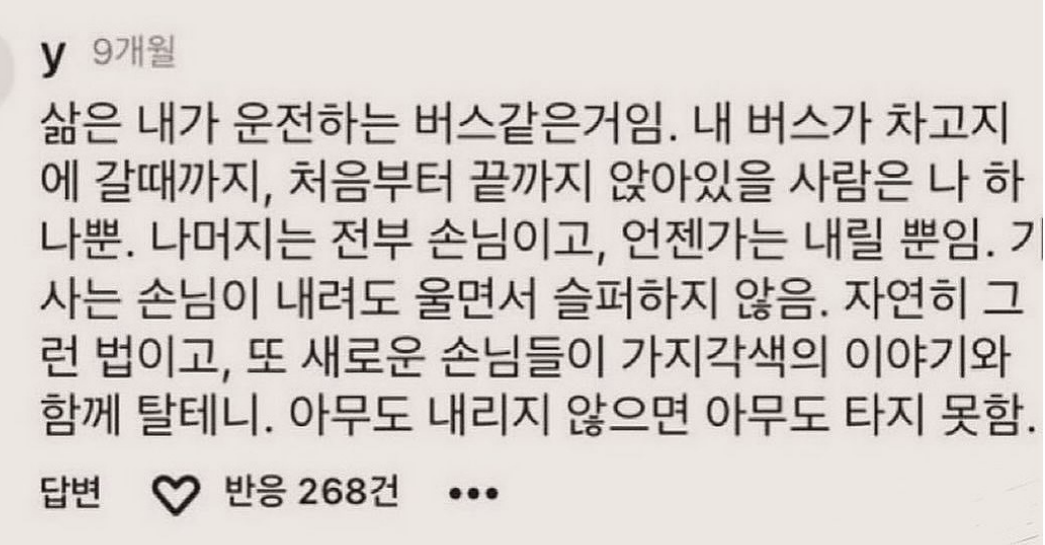 <당신의 인생이 왜 힘들지 않아야 한다고 생각하십니까>라는 쇼펜하우어 말이 생각난다. 행복은 금방 잊혀지고, 불행은 내내 온몸과 마음으로 맞닥드려야 한다. 그게 인생이다. 다 그렇게 살고 있다. 하지만 힘든 시간들도 내가 선택한 일로 차곡차곡 채우자. 그리고 견디자. 내가 그 시간만큼 단단해져있지는 않았더라도 견뎌낸 것만으로 스스로를 칭찬할 만 하다.