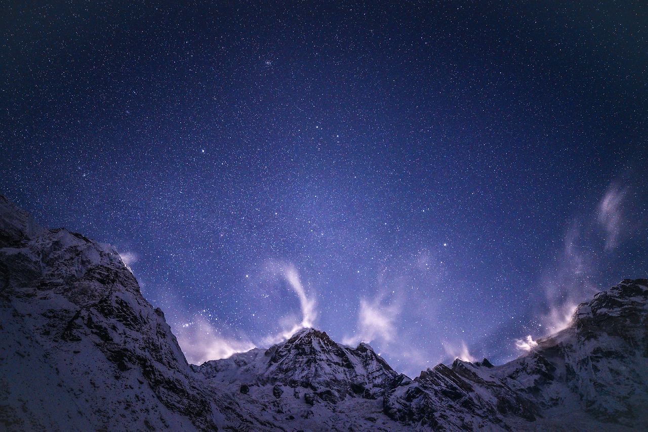 한 바퀴 빙 돌아본다. 반대편에 6,997m 마차푸차레가 아까 감추었던 꼬리를 내놓고 있다. 그리고 7,291m 안나푸르나 남봉, 6,441m 히운출리, 5,663m 타르푸출리가 파노라마로 펼쳐진다. 하늘은 360도를 에워싼 히말라야 고봉에 갇혔다. 밤하늘은 검지 않다. 낮보다 더 시리도록 푸르다. 안나푸르나 정상에서 하얀 영혼이 스멀스멀 나와서 푸른 밤하늘에 스며든다. 이 시간 내가 여기에 있어서 감사하다.