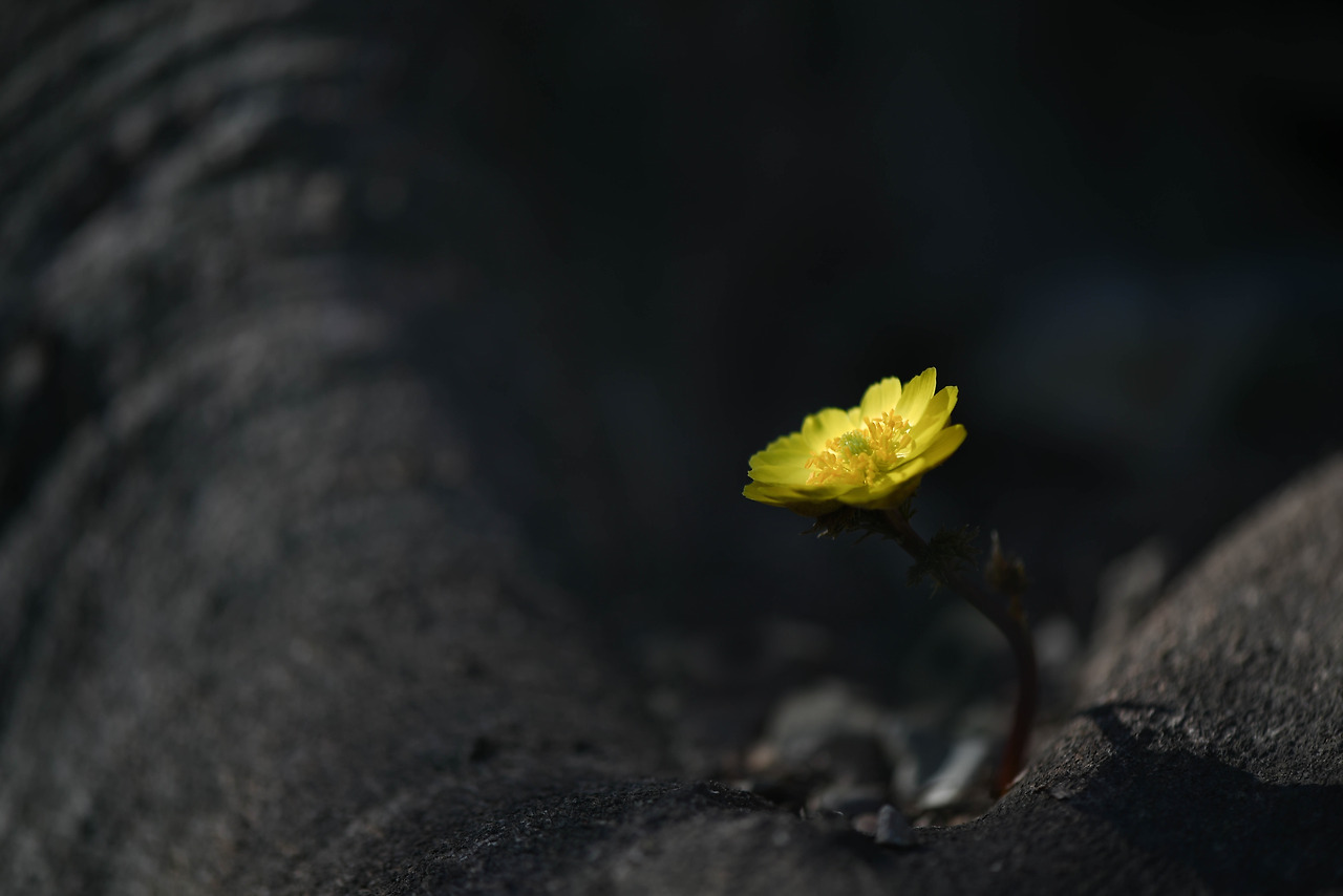 그루터기 안쪽에 살짝 복수초가 자리 잡고 있다.