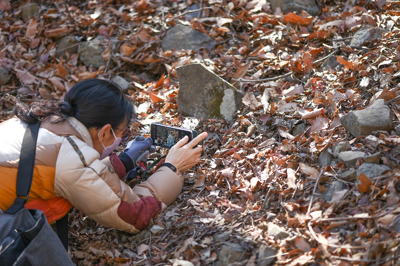초입에서 만난 노루귀를 보면서 그녀는 말을 건낸다.