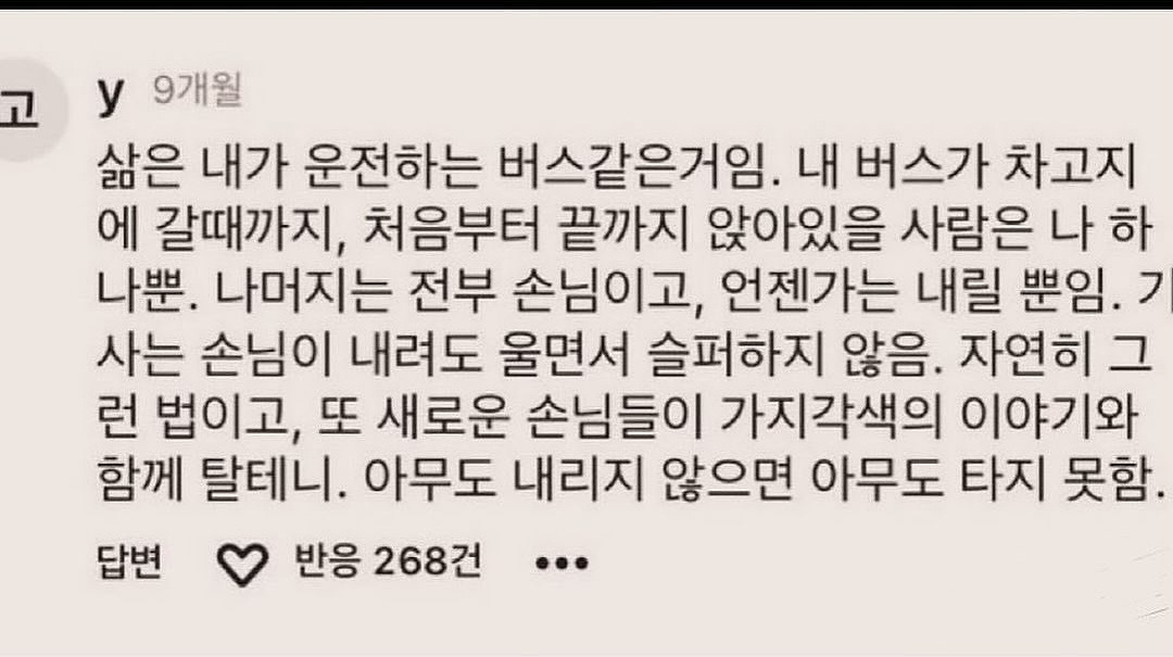 참 공감된다. 끝까지 내곁에 있는 사람은 자신이다. 단지 지금 내 옆에 있는 사람에게 잘하자.