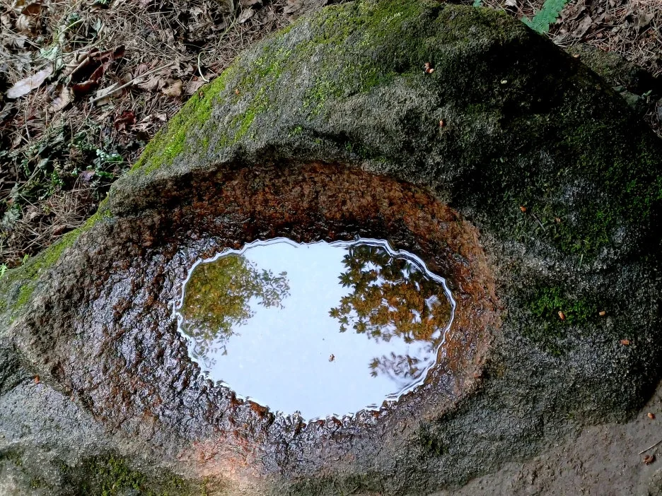 경주 남산 칠불암 입구 숲에 작은 약수터가 있다. 오른쪽에 빨강, 파랑의 바가지가 걸려 있었다. 시원한 약수 한 모금하고 사진을 찍으려고 두 바가지를 가지런히 올려 놓았다. 발걸음 돌아서니 눈 앞 작은 바위에 고인 물이 보인다. 그 한뼘 남짓 물이 하늘과 숲을 담고 있었다.