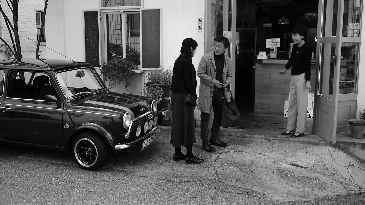 병수는 돌고 돌아 다시 건물 1층으로 복귀해 담배를 문다. 영화 속 신의 계시처럼 제주도에서 12편의 영화를 만들겠단 다짐을 하는 것 같기도 하고, 회한에 잠긴 것 같기도 하다. 각 에피소드는 컷 없이 기타 선율로 교묘히 이어진다. 홍상수가 직접 만들고 연주한 곡이다. 보이스오버를 통해 현실과 상상의 혼재를 드러내는 방식은 익숙하지만 서늘하다. 줄곧 홍상수 영화에 출연했던 김민희는 제작실장으로만 참여했다.