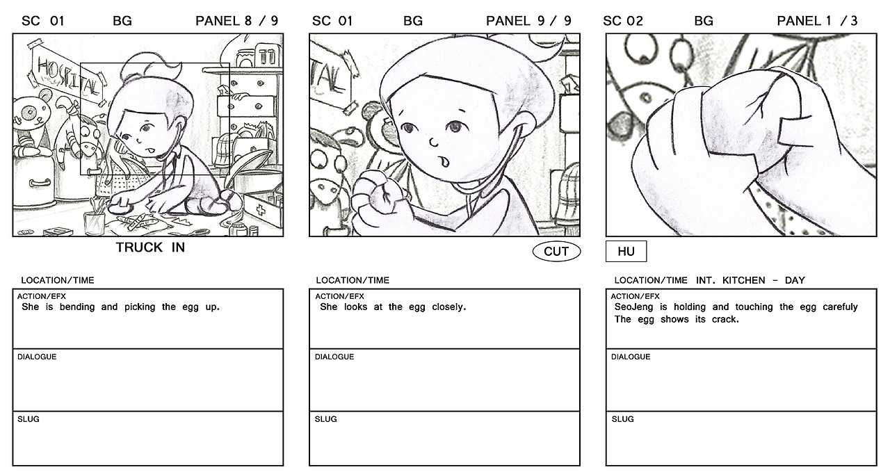 스토리보드 작업이죠. 스케치한 썸네일을 애니메이션을 할 수 있게 구체적인 디렉션이 들어가야 하거든요. 캐릭터의 로케이션 즉, 배경에 따라 시퀀스가 몇 개 나올지 정하고 그 배경에서 카메라 시점에 따라 씬이 나뉘는 것이라, 그 각각의 씬의 캐릭터 포즈를 구체적으로 쪼개 넣어 디렉팅 내용까지 적어 넣는 것이죠. 실무에서는 스토리보드 아티스트들이 스크립트를 읽으면서 필요한 장면 장면을 썸네일로 먼저 그린 다음 디렉터와 회의를 거치고 나면, 스토리보드 작업을 본격적으로 해요. 저는 이 작업이 쉽지는 않았어요. 디자인도 물론 중요하지만, 화면에서 카메라가 어느 방향에서 어떻게 캐릭터를 바라보며 그려내느냐가 이야기의 몰입도를 나타내는 것이라 굉장히 특별한 작업이라고 생각해요.