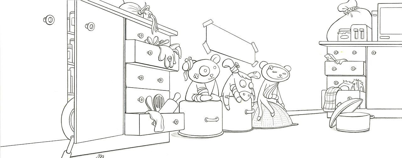 그에 앞서 배경 레이아웃을 해요. 그래야 캐릭터의 위치를 정확히 그려 넣을 수 있거든요. 배경을 그릴 때도 기본적으로 스토리보드의 카메라 앵글과 워킹을 정확히 파악하고 그려야 하는 섬세한 작업이면서도 화면에서 캐릭터만큼이나 큰 비중으로 보이는 이미지이기 때문에 신경 써야 하는 작업이죠. 실무에서는 실제로 애니메이션 작업보다 일정이 먼저 시작돼요. 러프(컬러만 미완성 상태) 혹은 컬러 완성 배경을 가지고 셋업을 먼저 한 다음, 애니메이터들이 캐릭터 작업을 하거든요. 졸업 필름 작업 때는 배경을 작업하면서 완성된 배경 씬의 애니메이션 작업을 하고 또 동시에 다른 씬 배경을 그리는 등 멀티를 해야 했었어요.
