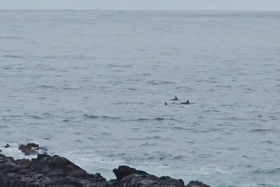 반가운 만남과 즐거운 담소를 가진 후 아쉬운 마음을 가진 채 해안도로를 따라 제주로 올라가려고 나섰다. 풍력발전기가 늘어서 있고, 돌고래 동상이 보이던 부근에서 아이들은 돌고래를 찾아보겠다며 눈에 불을 켜고 서쪽 바다에 시선을 고정하고 있었다. 그러다 정말 보았다. 아주 가까운 바다에서 돌고래 떼가 움직이고 있었다. 차를 급히 세우고 돌고래 떼의 유영을 구경했다. 생각지도 못한 선물을 받은 기분이었다. 물속에서 움직이고 있는 몸통 윗부분만 슬쩍슬쩍 봤지만 분명 돌고래였을 것이다. 설마 상어나 참치는 아니겠지.