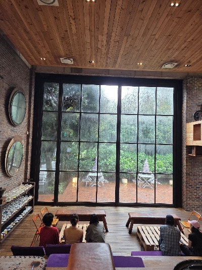 쏟아지는 빗소리에 눈을 떴다. 분명 아침인데 다시 밤으로 가고 있는 듯 하늘은 캄캄했다. 거실에서 내다 보이는 테라스는 날씨 좋은 날에 앉아 있기 참 좋은 공간이었는데 한 번도 이용하지 못했다. 여덟 시 반에 맞춰 2층으로 조식을 먹으러 갔다. 우리는 안거리에 묵고 있었고 그날은 밖거리 손님들도 함께였다. 우연히도 밖거리 손님들도 우리 동네 주민들이었다. 대화를 하다 보니 스테이 사장님은 큰 아이 군대 선임이었다. 이런 우연이 겹쳐 대화의 소재가 풍부했다. 10시에 맞춰 큰 아이 수강신청을 성공적으로 끝내고 퇴실했다. 스테이 사장님 따님 추천으로 공부하기 좋은 카페라는 서귀포 '테라로사'로 향했다. 비 내리는 테라로사는 아름다웠다. 긴 창으로 귤밭이 내다 보이는 곳이었다. 오랜만에 마신 드립커피도 정말 좋았다. 이번 여행을 통해 끊었던 커피를 다시 시작했는데 여행 중에만 허락한 일탈이었다. 집에 돌아오니 커피 생각이 나지 않았다.