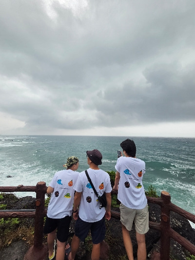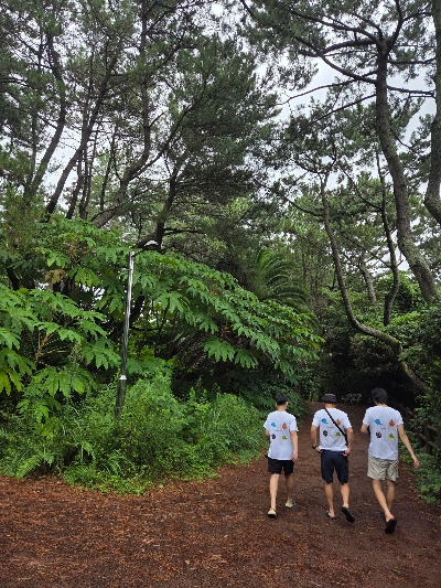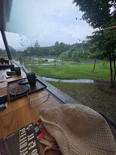 8시 반으로 딱 정해놓은 조식 시간덕에 우리 집 늦잠꾸러기들 전원 기상하여 아침을 일찍 시작했다. 성산포여객터미널 기념품 가게에서 패밀리 티셔츠를 구입했었다. 흑돼지, 한라산, 한라봉, 돌고래가 그려져 있는 티셔츠였다. 우리 넷은 똑같은 티셔츠를 입고 화합을 다짐했다. 여전히 비는 내리고 뭘 할까 고민하다가 숙소 근처에 자연이 아름답기로 소문난 카페 '담소요'로 1차 목적지를 정했다. 이른 시간에 도착하니 창가 쪽 자리를 잡을 수 있었다. 아이들은 각자 공부를 했고, 남편과 나는 책을 읽다 비가 그치는 것을 보고 산책을 했다. 산책하기 너무 좋은 곳이었다. '담소요, 고요한 연못가를 거닐며 이 시공간의 아늑한 포옹 속에 내 몸과 마음을 한가로이 부려놓아 오롯한 쉼을 즐기시길 소망한다'는 글귀 그대로 충분히 좋은 시간이었다.